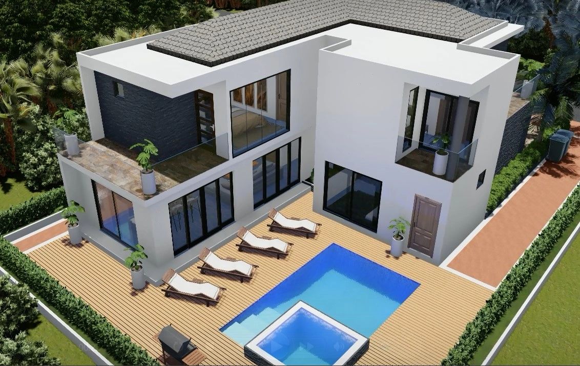 This villa is a 3 bathroom 4 bedroom villa, two floor with balcony, Living room and Kitchen area and can be customized as you wish